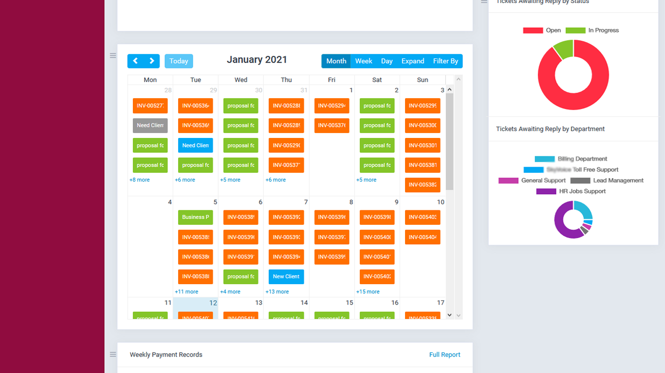 Have clear view of all your company events upcoming invoice payments, contract expirations, estimates expiration, task finish date, reminders. You’ll never miss anything from the calendar.