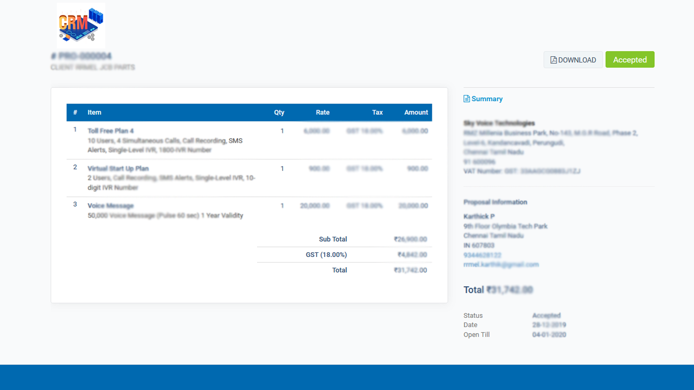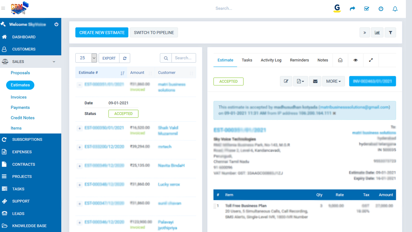 Create estimates within minutes. Send to your customers and wait for them to accept. Ability to convert the estimate to invoice after the customer accepts. Your customers can view and make actions on the estimate even without logging in.
