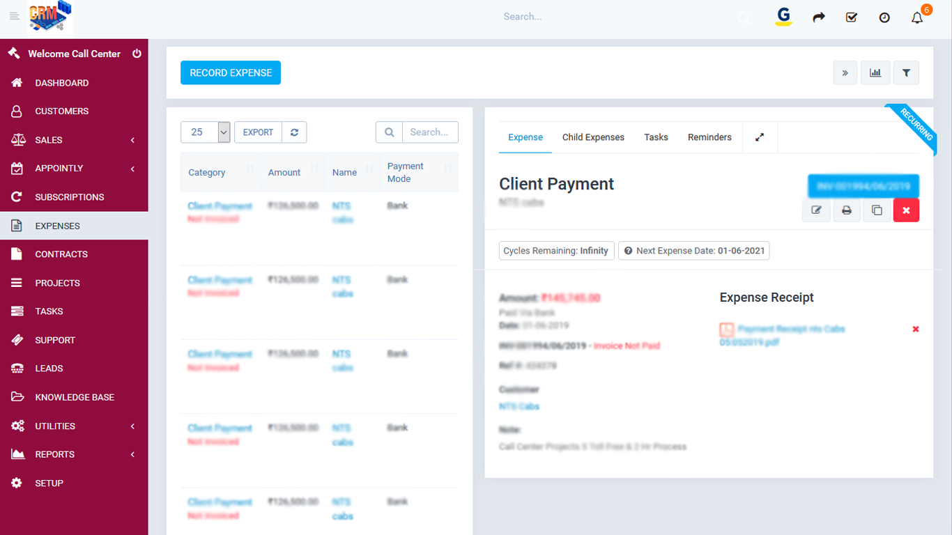 Creating recurring expenses. Setup a recurring expense and the expense will automatically be created after the specified period.The period time could be days, weeks, months, or years. Ability to set expenses billable to customers or specific projects.