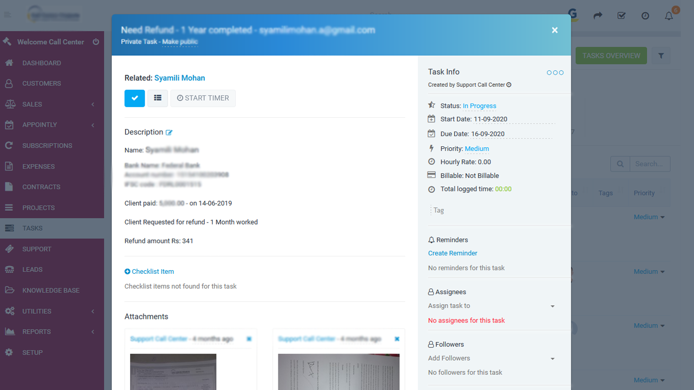 Assign task to multiple staff members, add followers, attach files. Let your staff comment on tasks, upload files. Task can be related to mostly all important features.