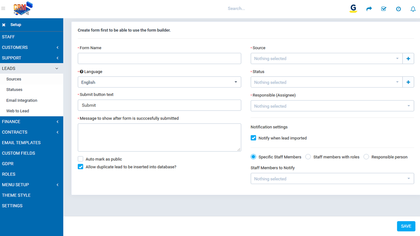 Perfex CRM Web to lead feature allows you to build a web form based on leads fields and custom fields to place it on your website, landing page etc. as an iframe. The visitor can then enter their names, email addresses, upload attachments and other basic information, to create a lead directly in the CRM.